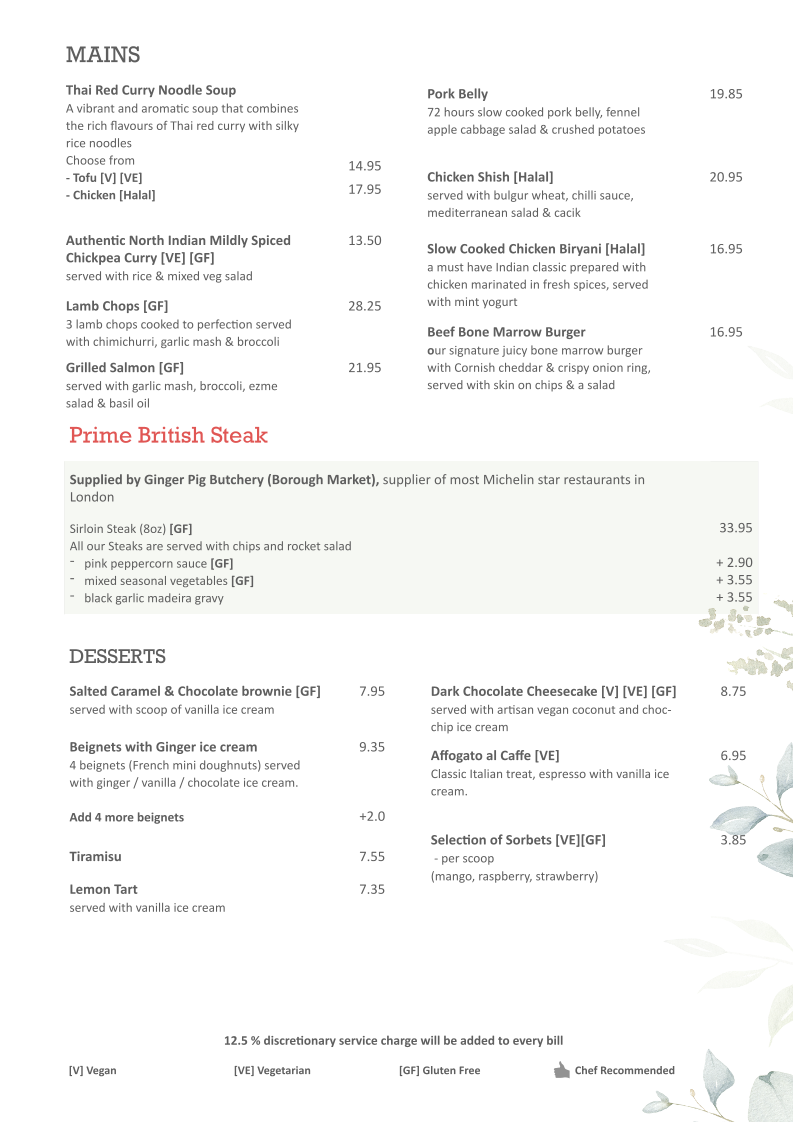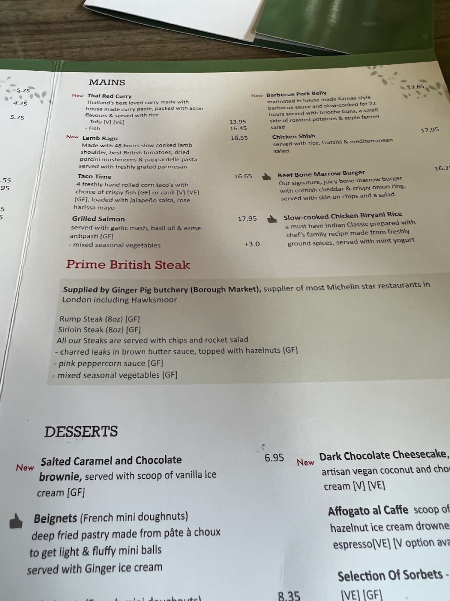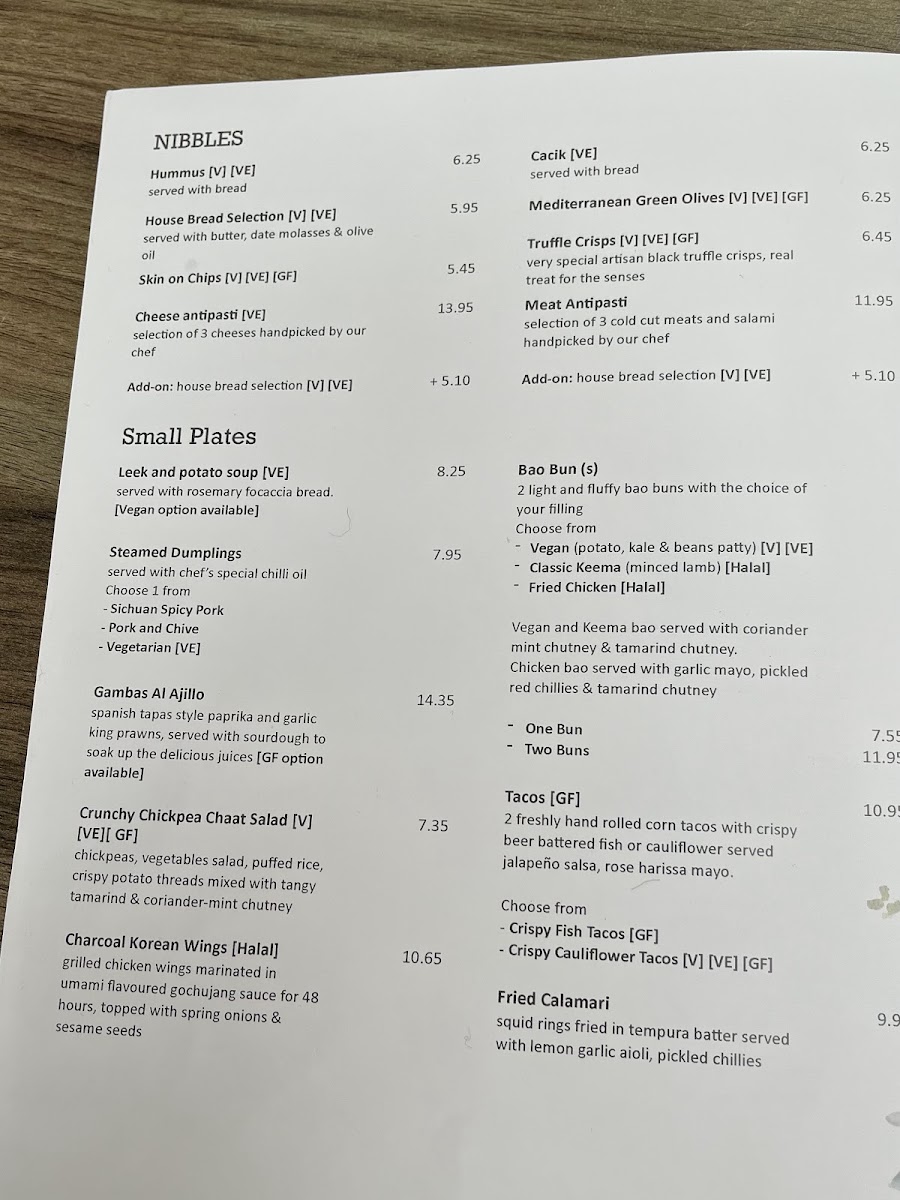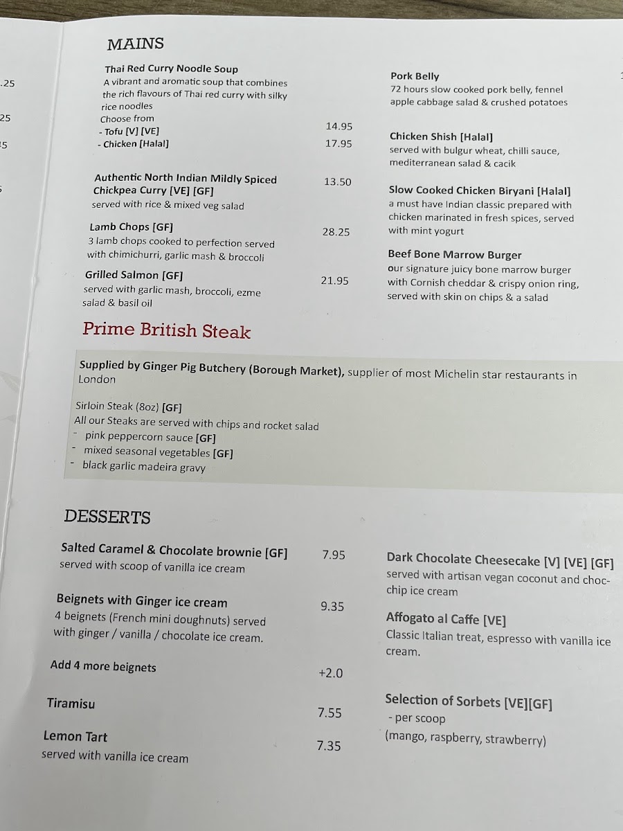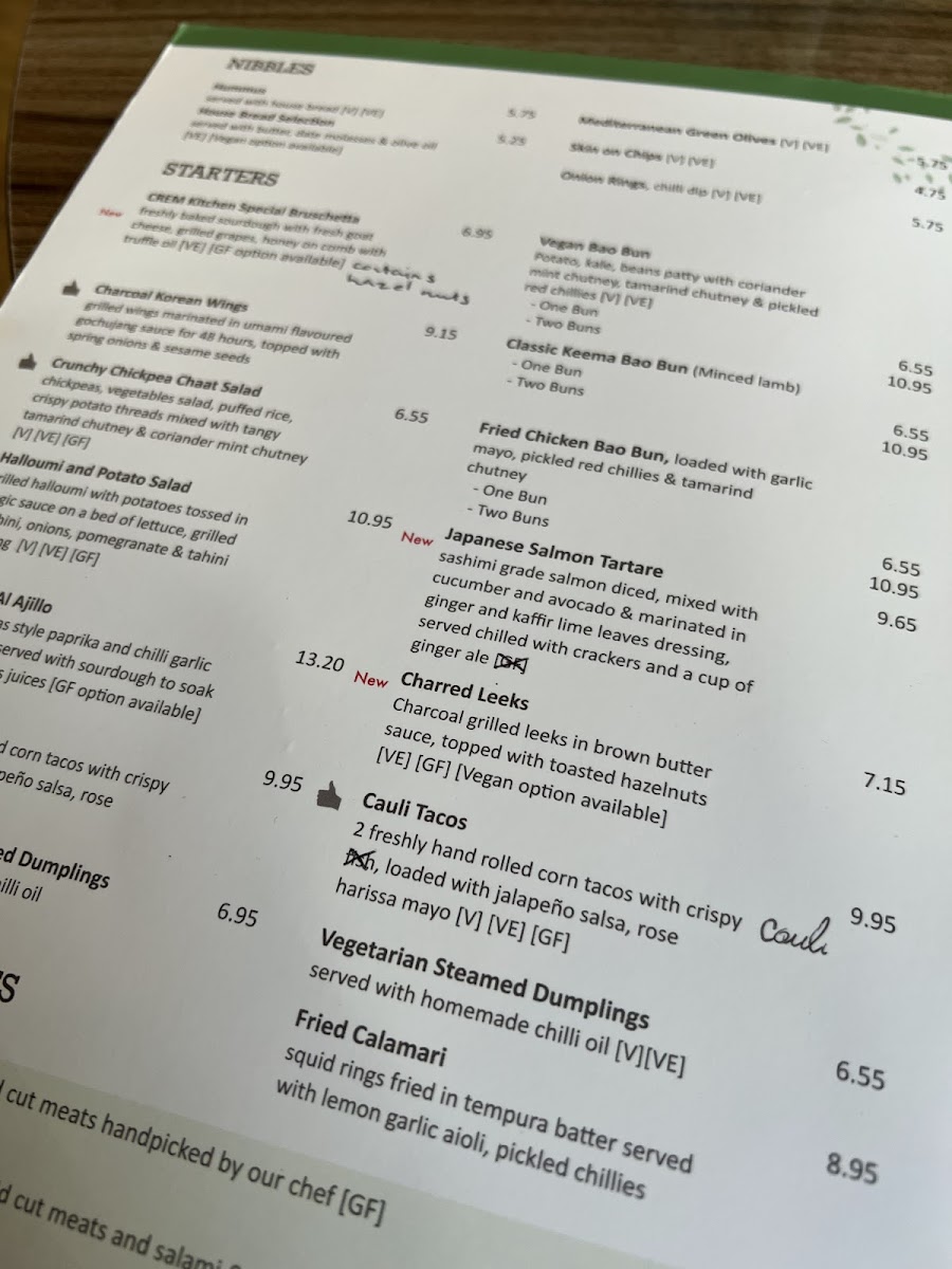 From a reviewer’s perspective, the menu at Crem Kitchen offers an impressively diverse and well-curated selection that balances comfort and creativity across courses. The mains stand out with hearty options like the Thai Red Curry Noodle Soup, Lamb Chops, and Slow Cooked Chicken Biryani, each reflecting a fusion of global flavors. The dessert lineup is equally indulgent, featuring highlights such as the Salted Caramel & Chocolate Brownie and Dark Chocolate Cheesecake, alongside more unique treats like Beignets With Ginger Ice Cream. For sharing, the sides-particularly the Housemade Christmas Stuffing and Fennel Apple Cabbage Salad-add a homely yet refined touch. The Sunday roast selection, including Dry Aged Sirloin Steak and Bavette Steak, caters to traditionalists, while the nibbles like Hummus, Truffle Crisps, and Mediterranean Green Olives provide excellent starters. Smaller plates such as Bao Bun, Steamed Dumplings, and Gambas Al Ajillo showcase variety and depth, complemented by first and second courses like Crunchy Chickpea Chaat Salad and Mexican Japanese Pork Belly. Overall, the menu feels thoughtfully constructed, offering something for every palate, though the absence of listed prices leaves a slight gap in transparency for diners planning their visit.